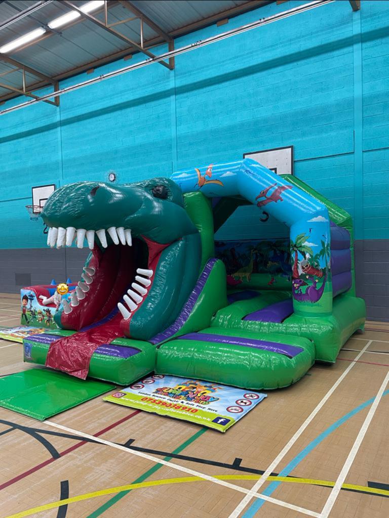 This eye catching 3D dinosaur bounce N slide, will have your party goers screaming as they slide down to escape the hungry dinosaur. This bounce and slide is guarantee to stand out at any celebration, its a show stopper!. The bright colours and stand out Jurrasicart work design are always a hit. There are foam steps on the inside to assist climbing to the slide, as well as a space to bounce around This is most definitely a hit.